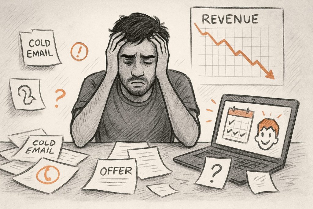 Relying on luck and referrals to get new clients. Wasting time on endless outreach and cold messages, hoping someone says yes. Feeling nervous on every sales call, not sure how to handle objections. Hearing “it’s too expensive” or “let me think about it” and losing the client. Stuck at low or inconsistent monthly revenue, no matter how hard you try. Second-guessing every decision, unsure what really works.