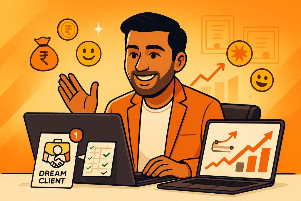 Attracting quality clients predictably, using a proven engine—no chasing, no stress. Streamlined prospecting: Your calendar fills automatically with qualified leads. Selling feels natural you guide every lead confidently with the CLOSE Method. Objections melt away; clients say “yes” without haggling on price. Scaling your revenue: Shooting from ₹1-5L months to ₹30-50L+ consistently. You operate with clarity, knowing exactly what to do next for growth.